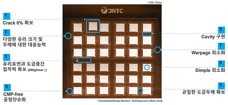 JNTC는 유리기판을 기반으로 한 정밀 가공, 레이저 관통홀(TGV), 에칭, 금속화(Metalizing) 및 도금 공정 기술을 보유하고 있으며, Glass를 활용한 고신뢰성 반도체 패키징 솔루션을 제공합니다.